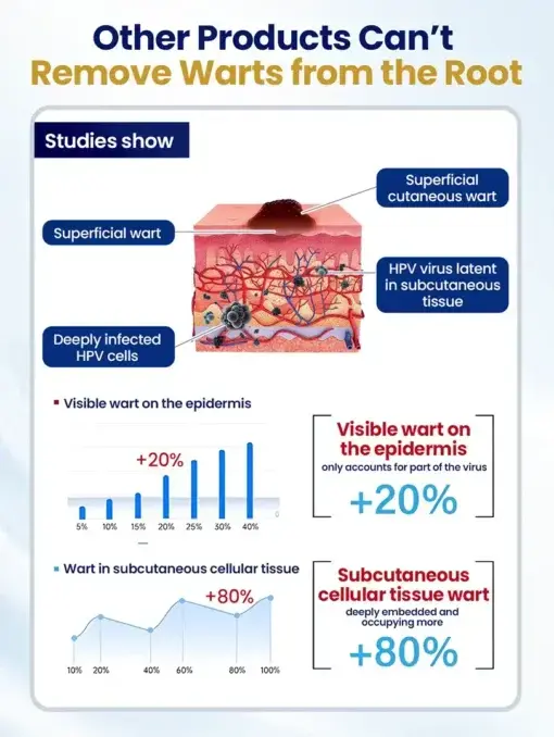 Most treatments only address what’s visible on the surface — roughly 20% of the wart. The remaining 80% lies hidden beneath the skin, where the human papillomavirus (HPV) continues to exist. When treatments target only the outer lesion and fail to reach the deeper infected tissue, the problem often reappears.