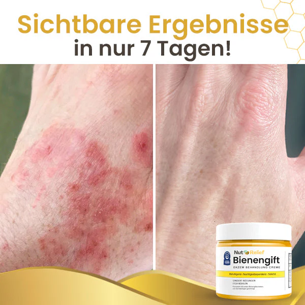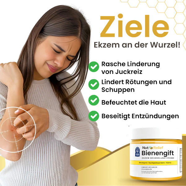 Sind Sie den ständigen Juckreiz und die Unannehmlichkeiten eines Ekzems leid? Sagen Sie Hallo zu NutRelief™ Bienengift Ekzem Behandlung Creme, Ihrem neuen besten Freund im Kampf gegen Ekzeme. Unsere revolutionäre Formel nutzt die heilende Kraft des Bienengifts, um schnell und effektiv Linderung zu verschaffen und die natürliche Schönheit Ihrer Haut wiederherzustellen.