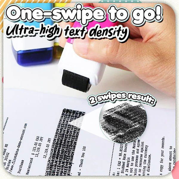 Maximum Privacy Protection A handy roller stamp that delivers a purely black ink of indecipherable jumbled letter pattern that is sure to totally block off any written or printed private information. Its blackout coverage can prevent unwanted eyes from reading through even as they squint near or light it up with a flashlight technique. What’s more? This protection stamp can cover a wide area which enables you to successfully hide any confidential and important information in just a quick roll. You can now protect identity within seconds without the noisy shredder, paper jams, messy and tiring scribbling, or the need to use electricity.
