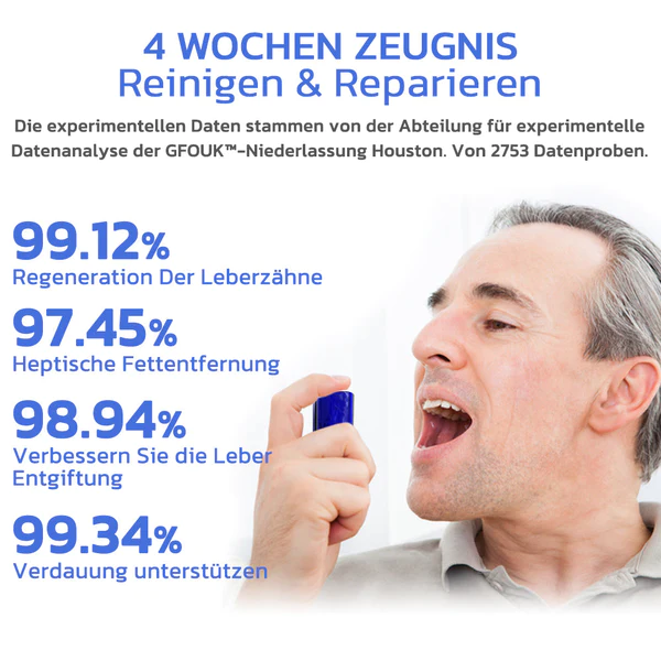 Das GFOUK™ OrganicLeaf Leberreinigung Detox Repair Spray verwendet einen molekularen Zerstäuber, um seine Bestandteile zu verteilen. Wenn sie in den Mund gesprüht und über die Mundschleimhaut aufgenommen werden, interagieren diese Substanzen mit der Leber und fördern eine verbesserte Entgiftung und die Regeneration des Lebergewebes. Im Vergleich zu herkömmlichen Leberreinigungsbehandlungen weist diese Methode eine um 67 % höhere Wirksamkeit bei der Entgiftung und Regeneration der Leber auf und übertrifft damit die Wirksamkeit herkömmlicher Medikamente.