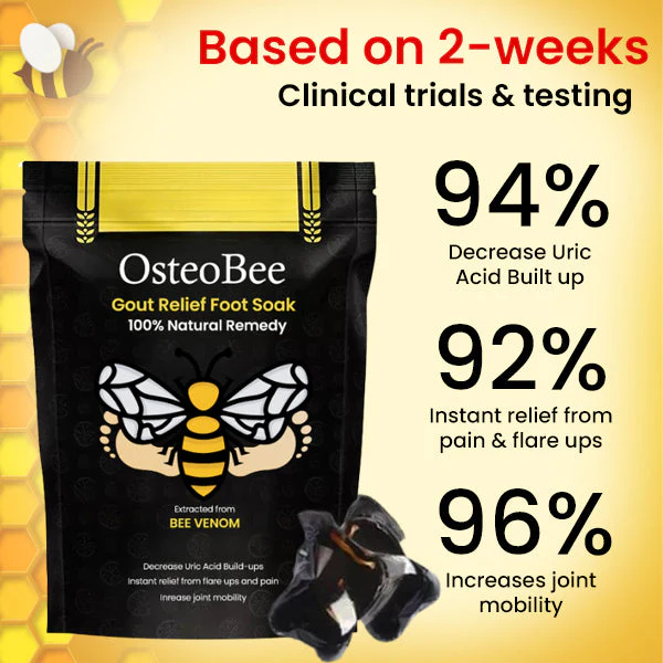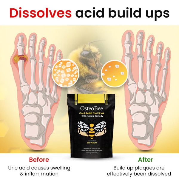 “As a healthcare professional, I recommend OsteoBee™ Gout Relief Foot Soak for patients suffering from gout. The natural bee venom extract in this product has been shown to effectively reduce inflammation and alleviate pain, providing a safe and holistic approach to managing gout symptoms. Regular use can help improve your quality of life by minimizing flare-ups and promoting overall foot health.”