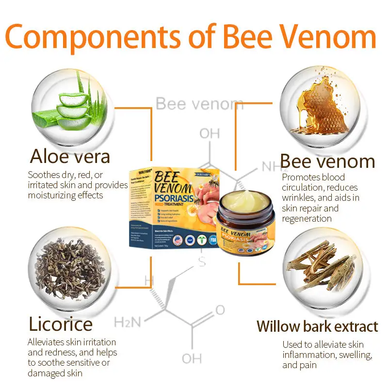 Bee Venom: Derived from New Zealand honeybees, bee venom has potent anti-inflammatory properties that alleviate psoriasis symptoms by modulating immune response and inhibiting pro-inflammatory cytokines.
