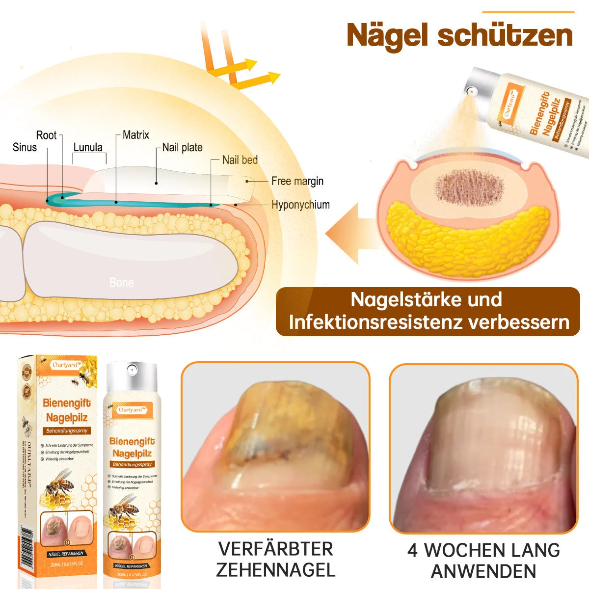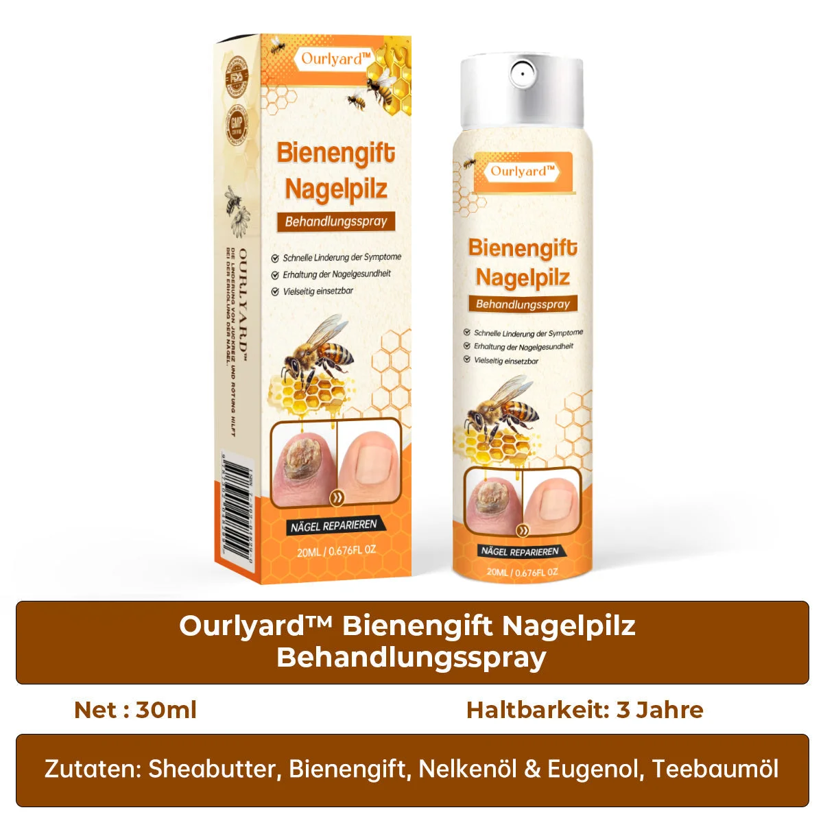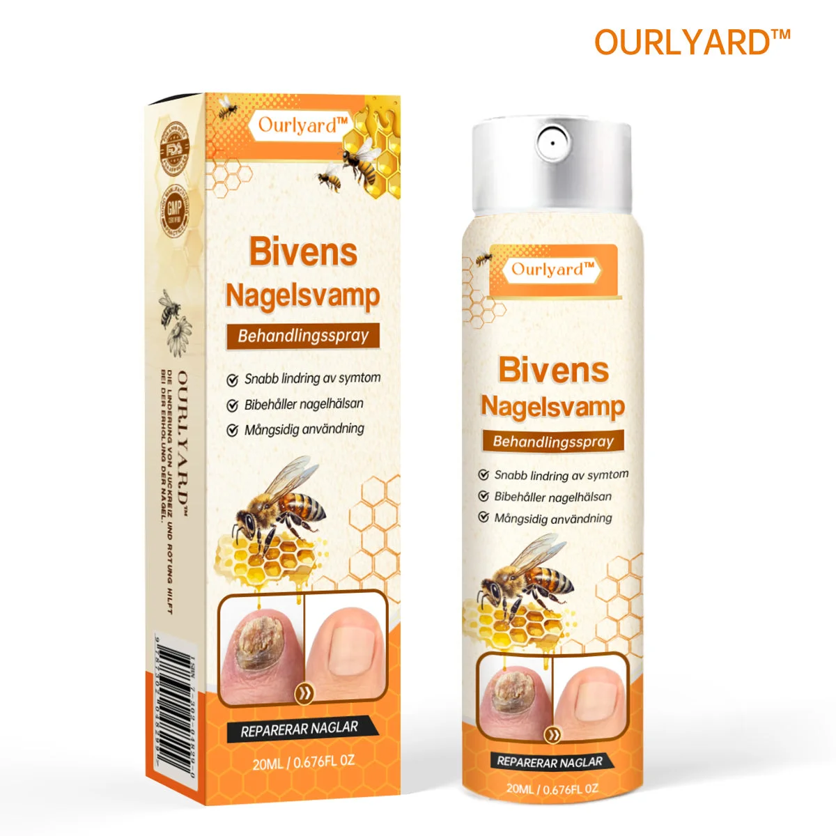 Ourlyard™ Biproduktspray för nagelsvamp med bivengift, utvecklad av dermatologer! Den innehåller kraftfulla svampdödande och antiinflammatoriska egenskaper som finns i bivengift. Dessa ingredienser tränger djupt in i nagelbädden och riktar in sig på den underliggande orsaken till nagelsjukdom samtidigt som de lugnar inflammation och obehag. Till skillnad från traditionella behandlingar erbjuder Ourlyard™ Spray en bekväm och kladdfri lösning på nagelsvampsproblem. Dess naturliga formula säkerställer skonsam men effektiv behandling utan hårda kemikalier eller biverkningar.