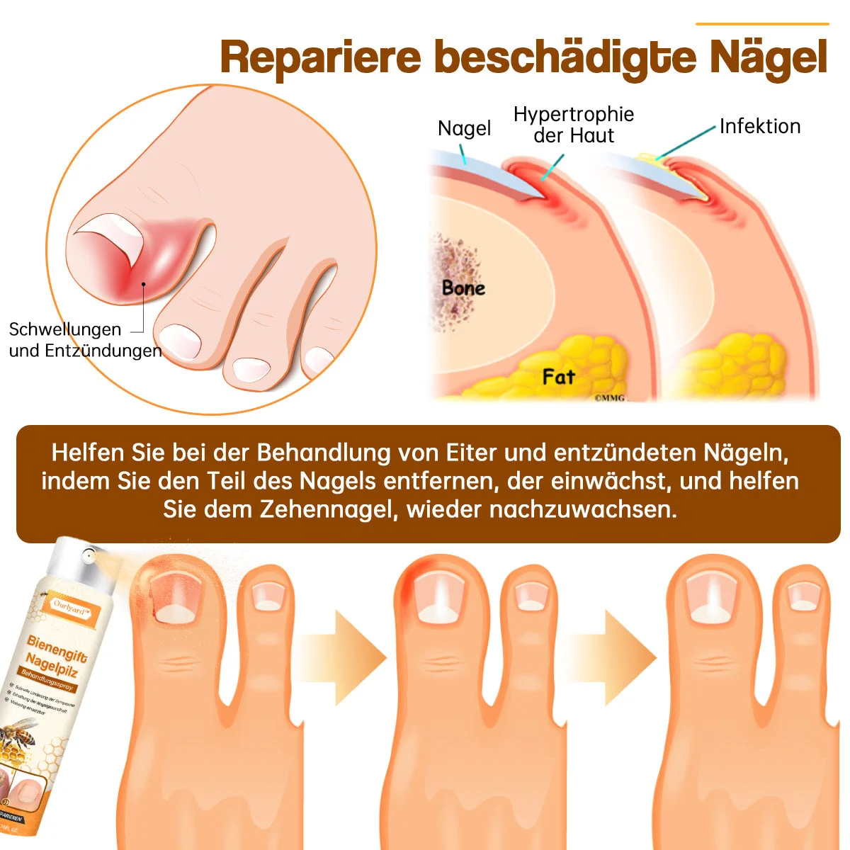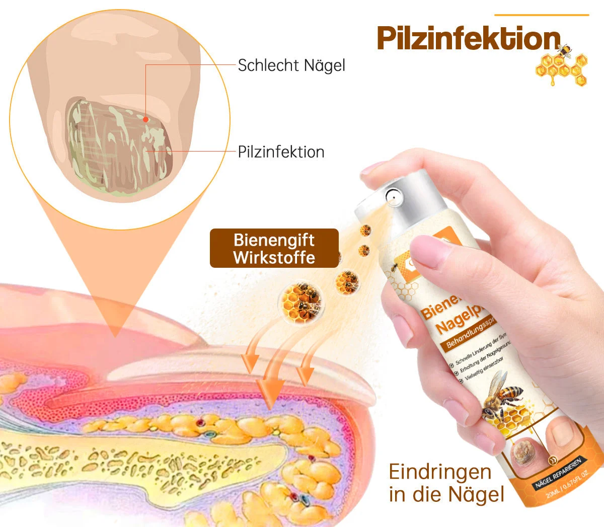 Vår produkt är en banbrytande lösning särskilt utformad för att bekämpa nagelsvamp. Den är berikad med aktiva ingredienser från bivengift som har visat sig ha kraftfulla svampdödande och antiinflammatoriska egenskaper. Sprayen penetrerar snabbt nageln och angriper svampen direkt, vilket snabbt eliminerar patogenerna. Vid fortsatt användning kommer du att märka att dina naglar gradvis återställs till hälsa, blir starkare och jämnare, samtidigt som obehaget från svampinfektioner lindras.