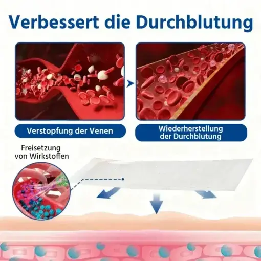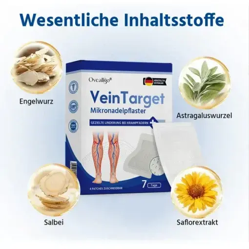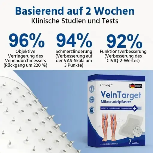 Oveallgoยฎ VeinTarget ist das erste von der MHRA registrierte und GMP-zertifizierte Mikronadelpflaster mit alpinen Krรคutern, das eine klinisch nachgewiesene Erfolgsquote von 96 % bei der Behandlung chronischer Veneninsuffizienz zu Hause aufweist. Sein bahnbrechendes transdermales Verabreichungssystem dringt 100-mal tiefer ein als topische Cremes und sorgt in nur 7 bis 14 Tagen fรผr eine sichtbare Verringerung der Venen. Verzichten Sie auf kostspielige chirurgische Eingriffe und stellen Sie auf natรผrliche Weise eine gesunde Durchblutung wieder her โ ganz bequem von zu Hause aus.
