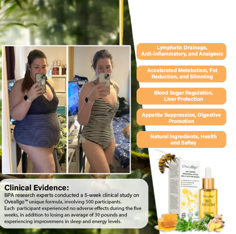 “This product is the most satisfying one I’ve used among so many weight loss products! I want to share my recent experience. I’ve been looking for something that can help me lose weight without feeling like I’m putting in a lot of effort and still allows me to indulge in desserts. I’ve tried weight loss pills before, but they had major side effects, keeping me up all night and causing weight rebound.Now, I’ve finally found a truly effective product-Oveallgo™ Bee Venom Intestinal Detox Belly Button Drops. I followed the instructions and the first time I used it, it was quickly absorbed, and I felt a slight warmth in my entire abdomen, sensing my digestive system kicking into high gear. I lost nearly 50 pounds in just a month. I want to share my story because I know there may be others going through what I experienced-wanting to enjoy delicious food but fearing weight gain. It’s truly painful.”