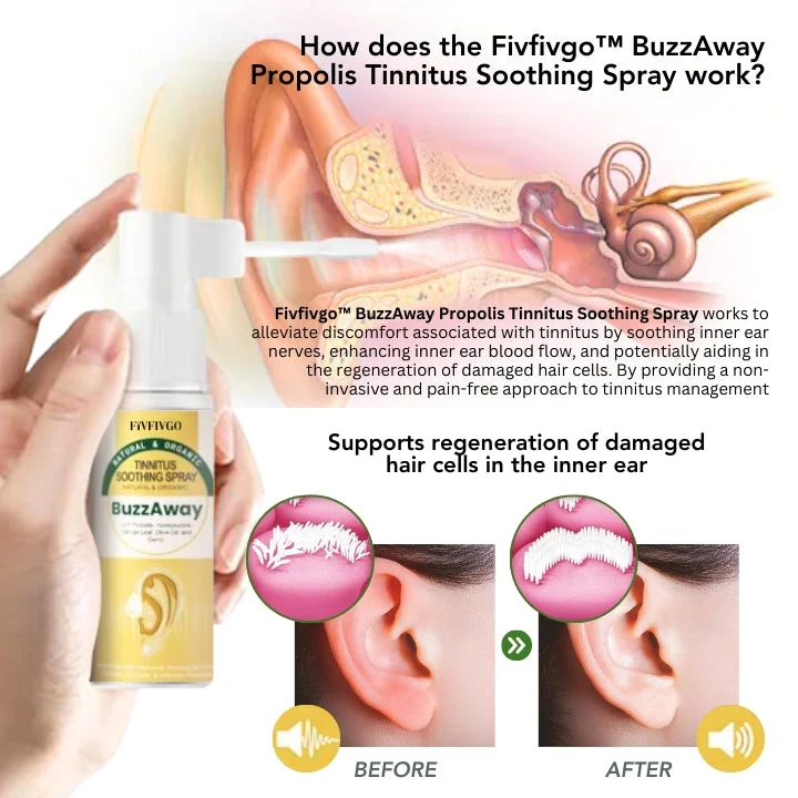 Experience relief from tinnitus with Oveallgo™ BuzzAway Propolis Tinnitus Soothing Spray. Made with natural propolis, this spray helps soothe and alleviate the ringing in your ears. Say goodbye to the constant distraction and discomfort of tinnitus and hello to a more peaceful and focused life.