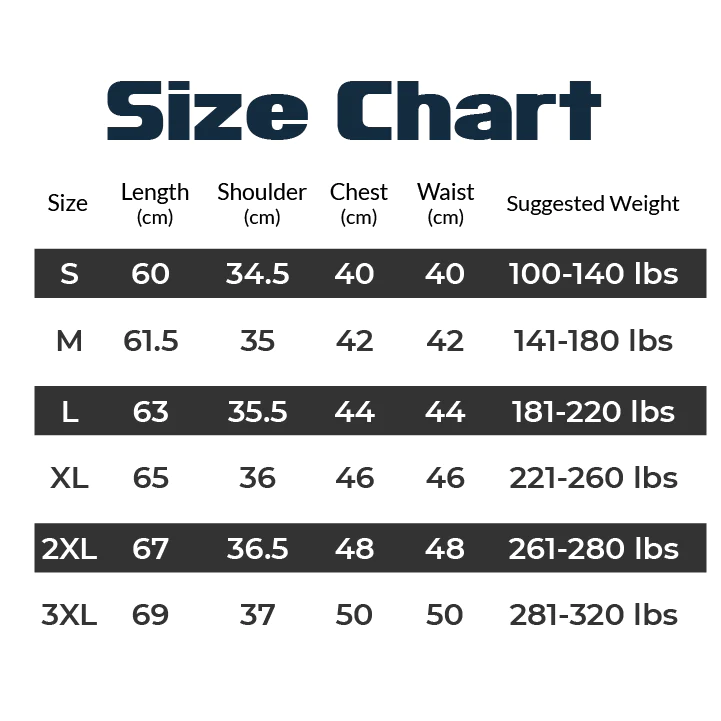 - Sizes: S (45kg-65kg), M (65kg-80kg), L (80kg-100kg), XL (100kg-115kg), 2XL (115kg-125kg), 3XL (125kg-145kg)
