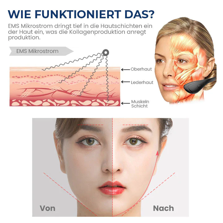Dieses innovative Gerät nutzt die Kraft von Mikroströmen und EMS (elektrische Muskelstimulation) Technologie, um die Stimulation der Gesichtsmuskulatur zu fördern. Es wurde wissenschaftlich entwickelt, um Nervenschäden zu vermeiden und verursacht während der Anwendung keine Schmerzen oder Unannehmlichkeiten. Die elektrischen Impulse regen die Muskeln an, sich zusammenzuziehen und zu entspannen, was zu einer verbesserten Gesichtskontur und -festigkeit führt. EMS hat Aufmerksamkeit erregt aufgrund seiner Fähigkeit, die Haut zu verwandeln und zu revitalisieren, indem natürliche Muskelbewegungen nachgeahmt werden.