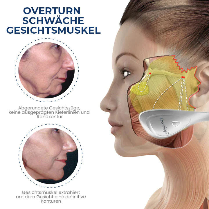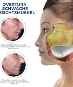 Der Oveallgo™ JawFit Pro Gesichtsskulptor ist ein Gesichtsverjüngungswerkzeug, das EMS (elektrische Muskelstimulation) verwendet, um sichere, nicht-chirurgische Ergebnisse für Gesichts- und Halsstraffung zu bieten. Es funktioniert durch die Stimulation der Muskeln in Ihrem Gesicht, was sie dazu anregt, sich wiederholt zusammenzuziehen, zu straffen und zu entspannen. Dadurch wird die Durchblutung und die Nährstoffversorgung der Haut erhöht. Dies hilft dabei, Ihre Haut straff zu halten und Falten, hängende Wangen, schlaffe Haut und andere Zeichen des Alterns zu reduzieren. Dieser Effekt bewirkt, dass die Haut um den Muskel herum nach oben gezogen wird, was insgesamt zu einem strafferen und festeren Aussehen führt.