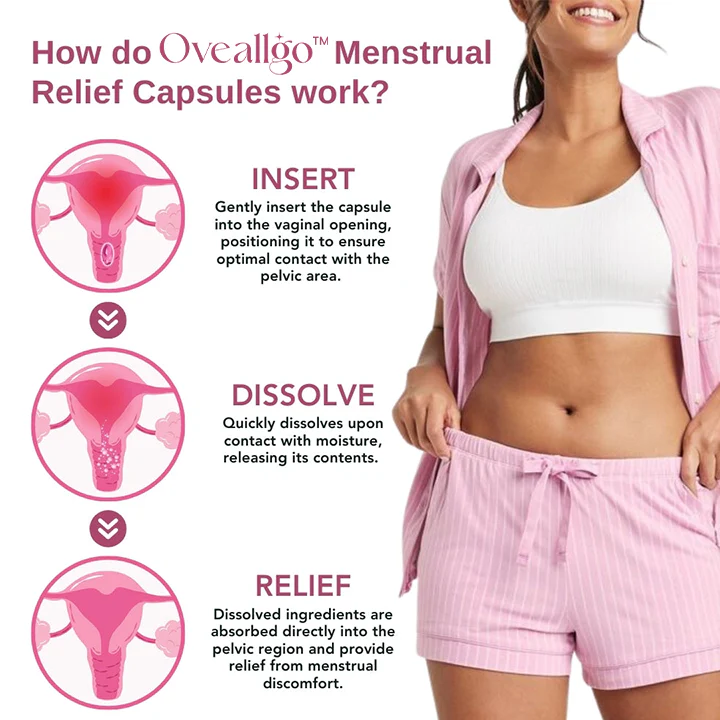Oveallgo™ Menstrual Relief Capsules work by offering targeted relief through vaginal insertion, allowing the active ingredients to directly reach the pelvic area. This unique delivery method ensures efficient absorption and effectiveness in soothing pelvic muscles, reducing inflammation, and alleviating menstrual discomfort. With scientifically backed ingredients like Vitamin E, fish oil, glycerin, and Vitamin C, these capsules provide a potent and natural solution for menstrual pain relief, promoting comfort and confidence during menstruation.