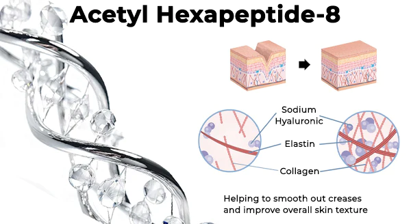 Acetyl Hexapeptide-8: Known as “Botox in a jar,” acetyl hexapeptide-8 is a cutting-edge peptide that mimics the effects of Botox without the injections. It works by inhibiting muscle contractions, effectively reducing the appearance of fine lines and wrinkles. This advanced ingredient promotes a smoother, more youthful complexion by relaxing facial tension and preventing the formation of new lines. Embrace the power of science-backed skincare with acetyl hexapeptide-8 and defy the signs of aging with confidence.