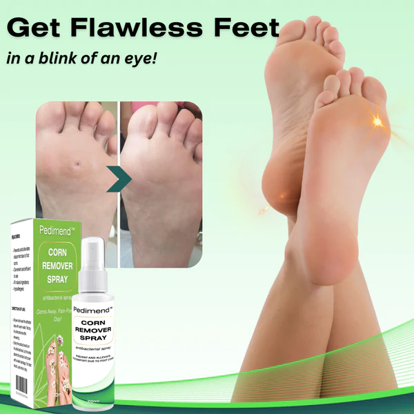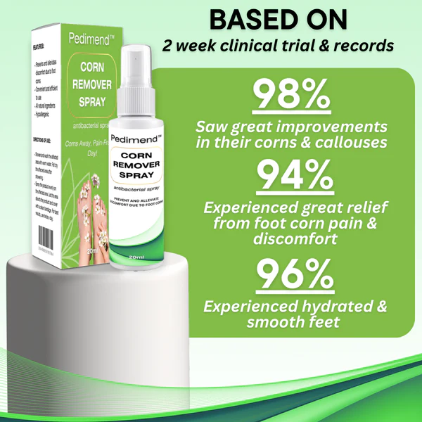 “Pedimend™ Corn Remover Spray come highly endorsed by medical professionals and have undergone rigorous clinical testing to verify their efficacy. In a recent clinical study conducted on individuals suffering from corns and thick callouses, the utilization of Pedimend™ Corn Remover Spray yielded significant results in terms of reducing corn size and alleviating pain & discomfort. The research illustrated that this Spray, with their exfoliating properties, gently eliminated layers of dead skin, while the cushioning layer offered immediate relief and distributed pressure evenly. Furthermore, the study noted Pedimend™’s ability to foster skin regeneration and prevent the recurrence of corns and callouses. Medical experts unanimously concur that Pedimend™ is a scientifically validated solution that can provide patients with an effective method for corn removal, long-lasting relief, and an overall enhancement of foot health.” – Dr. Peter Griffinson, M.D., Podiatrist