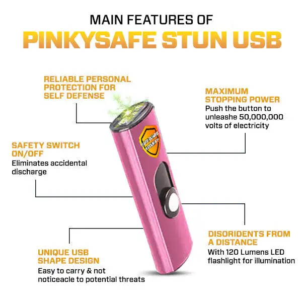 The PinkySafe™ USB is a formidable self-defense tool designed to keep you ahead of unexpected dangers. With a 50,000,000-volt stun gun, it effectively neutralizes attackers, allowing you a safe escape. Enjoy peace of mind knowing you have a reliable means to protect yourself. It emits a loud, deterrent sound when activated, discouraging potential threats. Stay prepared and secure with PinkySafe™.