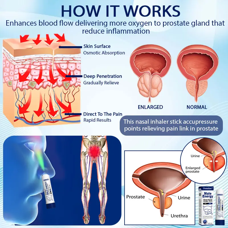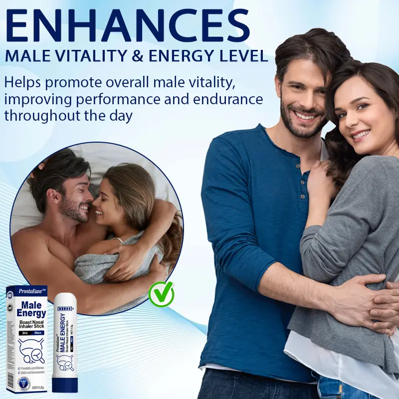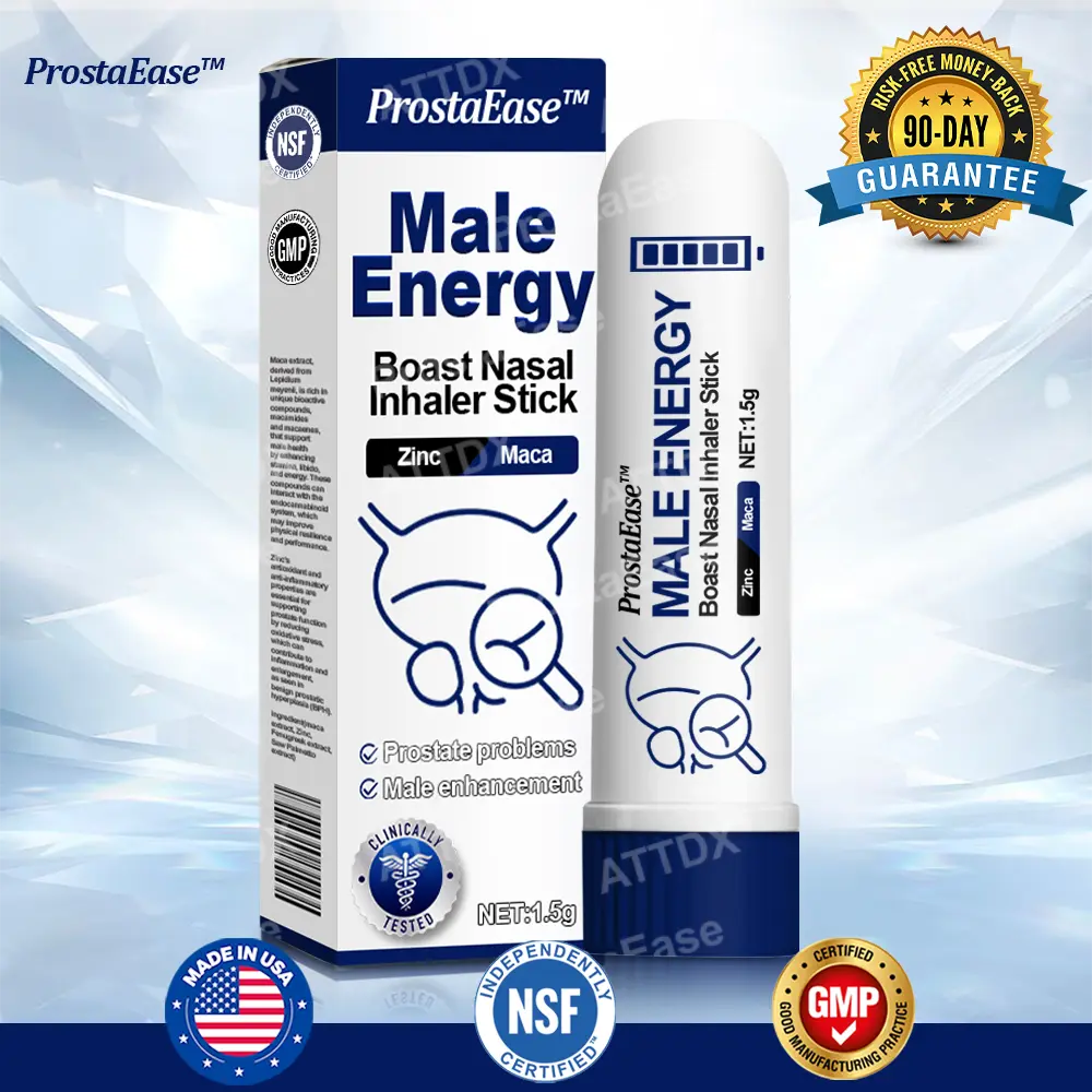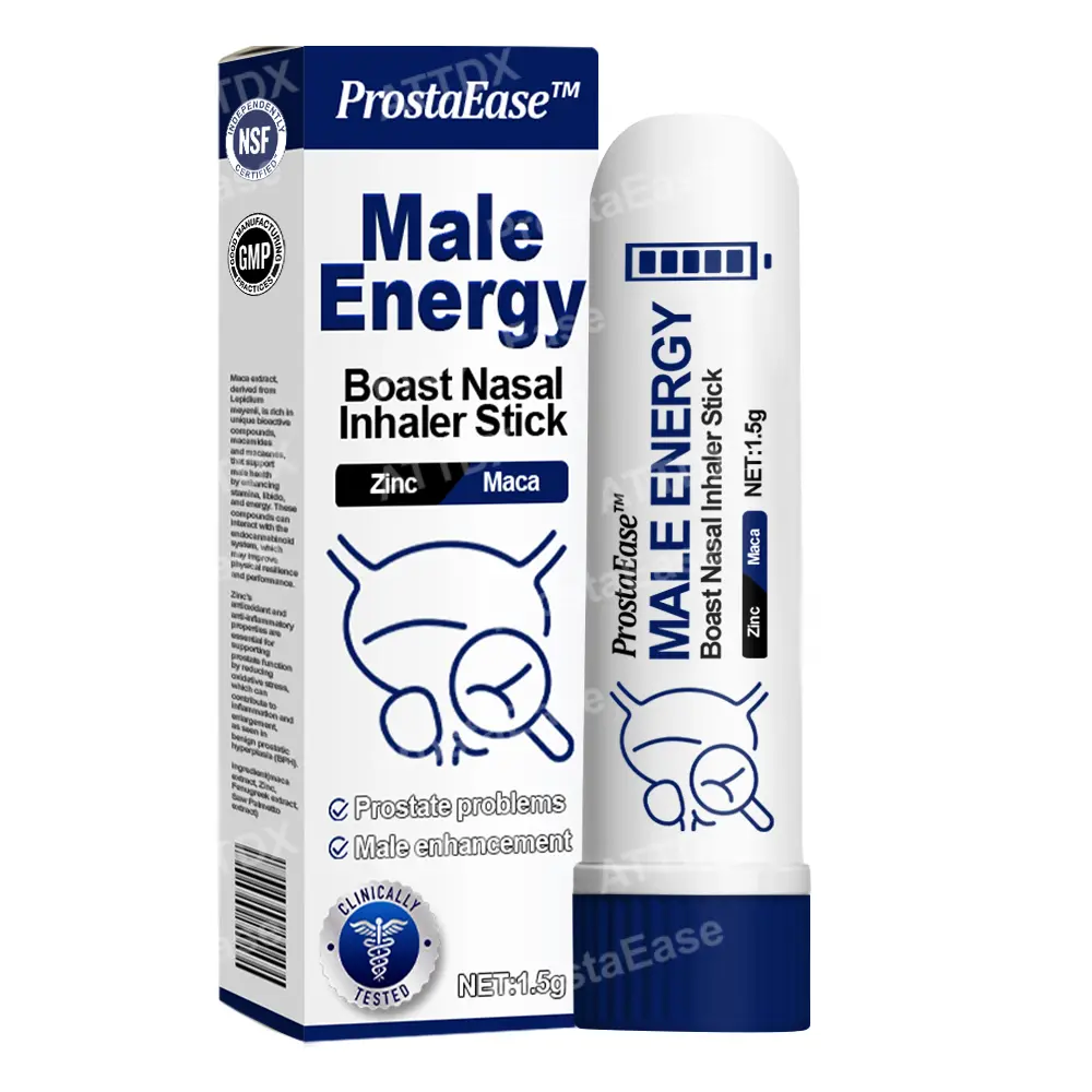 ProstaEase™ Male EnergyBoost Nasal Inhaler Stick combines the prostate-supporting benefits of zinc and the vitality-enhancing properties of maca extract. Zinc helps reduce oxidative stress and inflammation in the prostate, supports testosterone production, and inhibits DHT to prevent enlargement, enhancing male libido and intimate performance. Maca extract boosts stamina, energy, and libido with bioactive compounds like macamides and macaenes, promoting hormonal balance and physical resilience for sustained male vitality and well-being. This dual-action approach supports both prostate health and overall male energy.