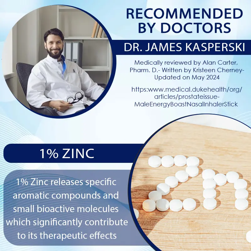 Dr. James Kasperski, a renowned urologist at the Health Sciences Institute, reviewed the impact of ProstaEase™ Male EnergyBoast Nasal Inhaler Stick containing 1% Zinc. On May 20, 2024, he reported that this product effectively aids in managing prostate health. The active ingredients like zinc and maca release specific aromatic compounds and small bioactive molecules which significantly contribute to its therapeutic effects.