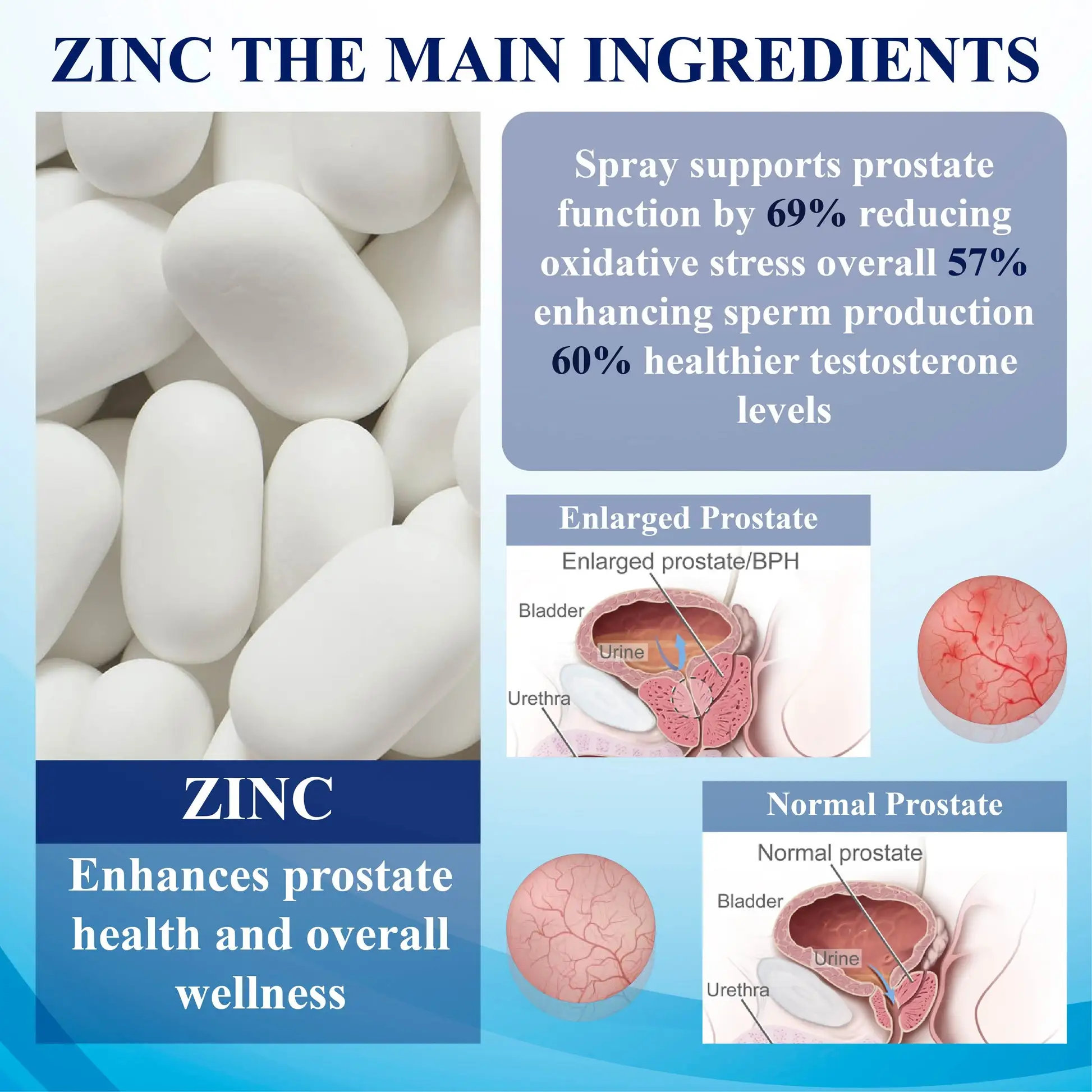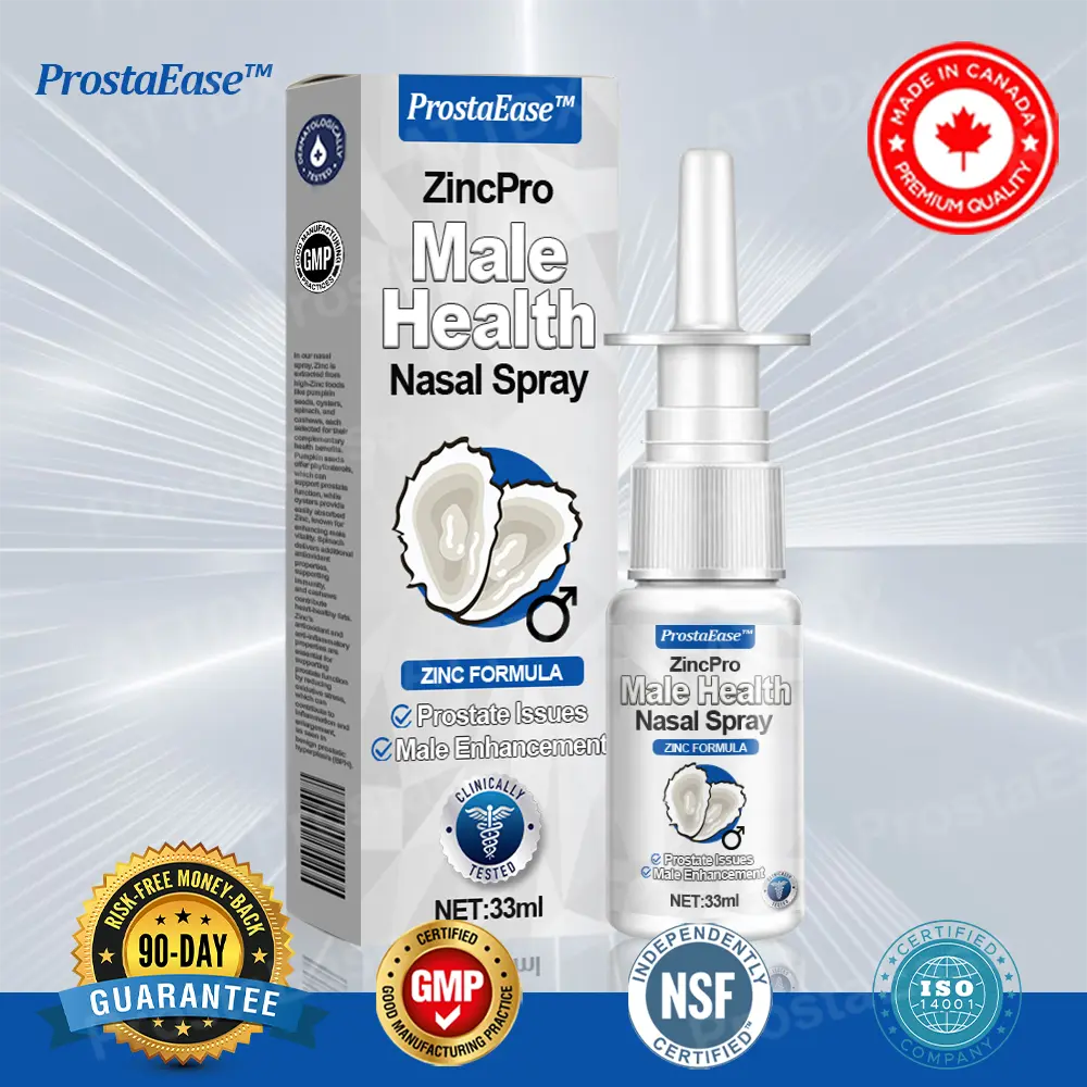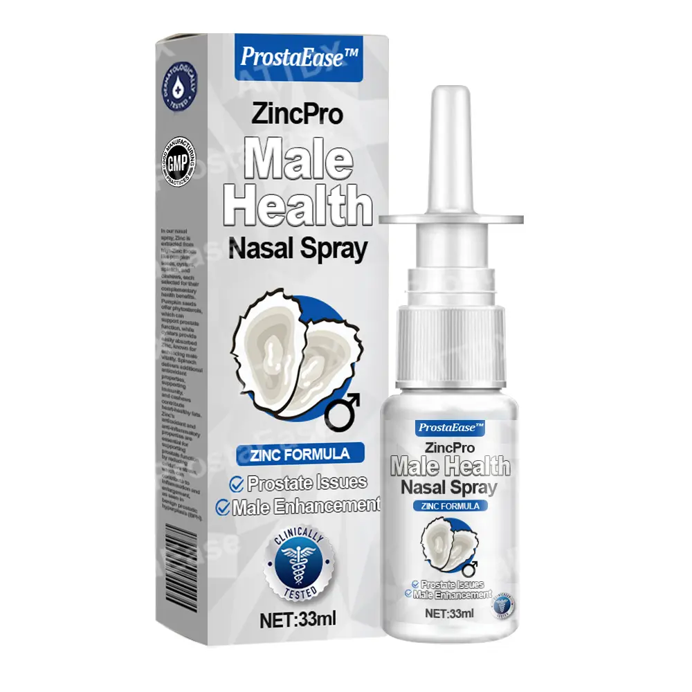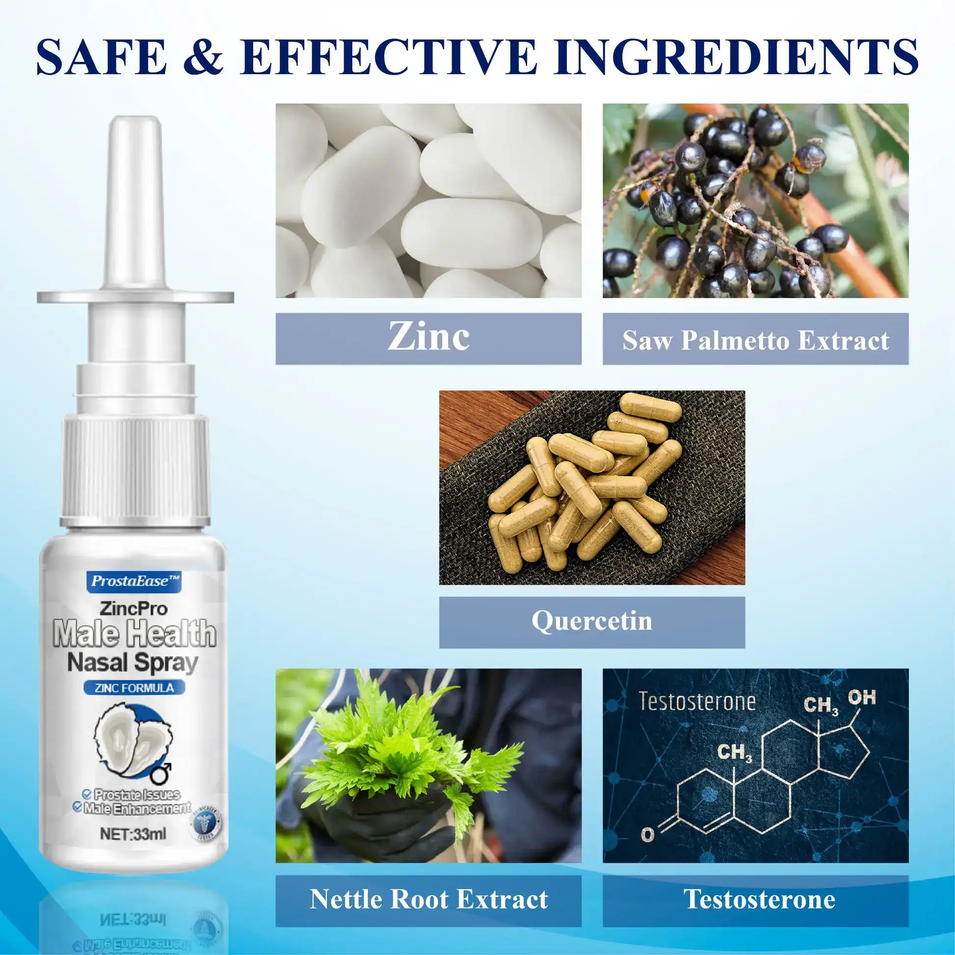 ProstaEase™ ZincPro Male Health Nasal Spray utilizes zinc derived from nutrient-dense sources such as oysters, pumpkin seeds, spinach, and cashews, each chosen for their distinct health advantages. This unique combination of essential ingredients supports prostate wellness and male vitality. Zinc contributes to testosterone production and reduces oxidative damage, thereby improving reproductive health. Saw palmetto prevents the conversion of testosterone to DHT for prostate support, while quercetin and nettle root provide anti-inflammatory properties, aiding prostate and urinary functions for comprehensive men’s wellness.