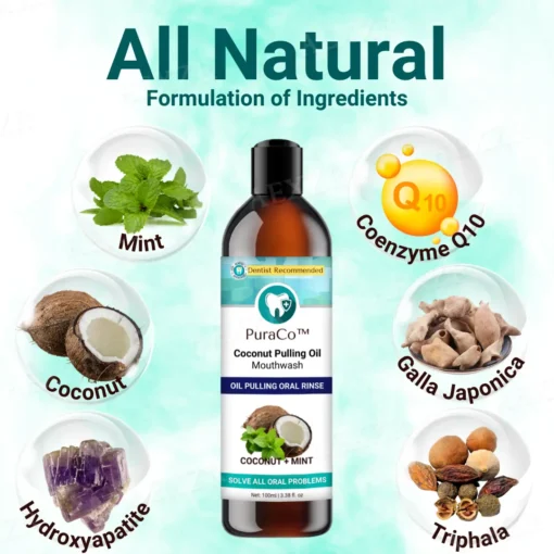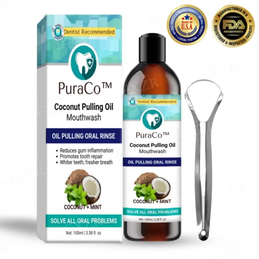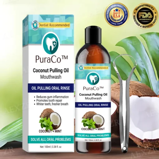 - How do I use PuraCo™ Coconut Pulling Oil Mouthwash? Simply swish a small amount (15-20ml) of PuraCo™ around your mouth for 2-3 minutes, making sure to cover all areas, including teeth, gums, and tongue. Spit out after use, and enjoy the refreshed feeling. Use daily for best results.