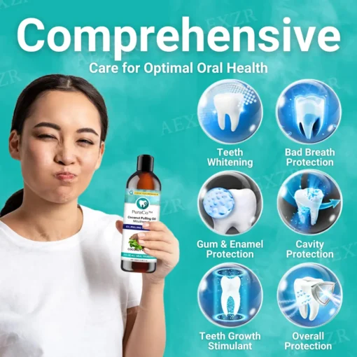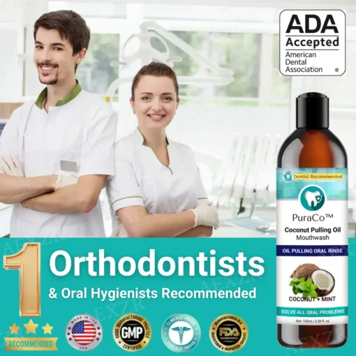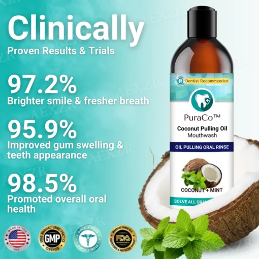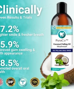 PuraCo™ Coconut Pulling Oil Mouthwash is not just another oral care product; it is a clinically proven solution backed by leading dental professionals for its effectiveness in maintaining optimal oral health. Extensive research has shown that oil pulling with coconut oil helps eliminate harmful bacteria, reduce plaque, and prevent gum disease. Renowned dentist Dr. Michelle Jorgensen and her team of experts have extensively tested PuraCo™’s formula, confirming its ability to support natural tooth regeneration, reduce inflammation, and improve overall gum health. Unlike traditional mouthwashes that rely on harsh chemicals, PuraCo™ utilizes 100% natural coconut oil to gently draw out toxins, offering a holistic approach to oral care.