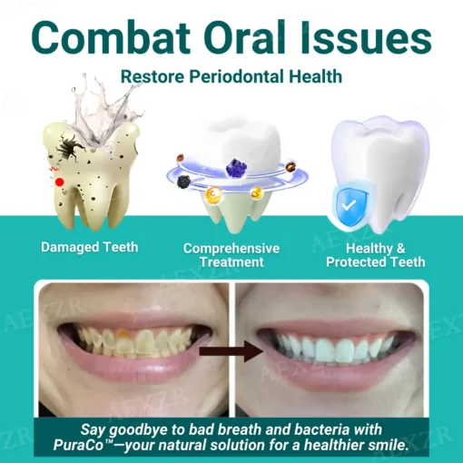 2. Total Oral Health Transformation: We’re confident that PuraCo™ will revolutionize your oral care routine. Our formula is designed to fight bad breath, reduce gum inflammation, remove plaque, and strengthen tooth enamel.