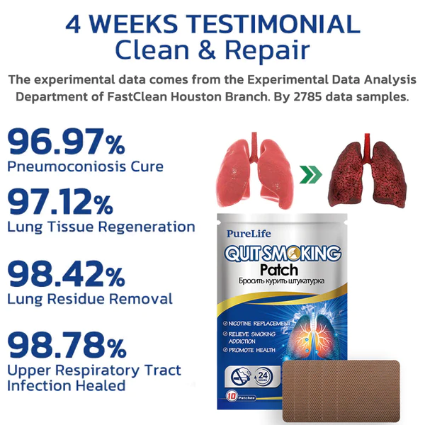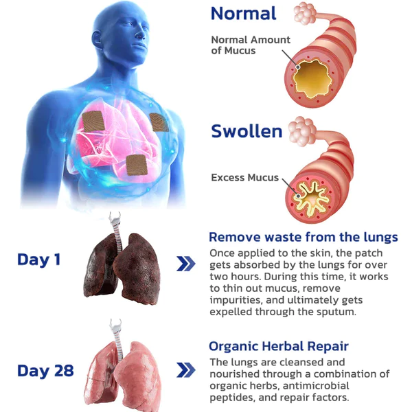 The PureLife™ FreshAir Herbal Lung Cleanse Repair Patch offers a simpler method to facilitate the removal of mucus and waste from the lungs, purify the lungs and upper respiratory passages, and fully restore any harm caused by allergies, asthma, dust, and smoking within an 8-week period. It provides an opportunity for individuals with weakened respiratory systems to regain the ability to breathe effortlessly.