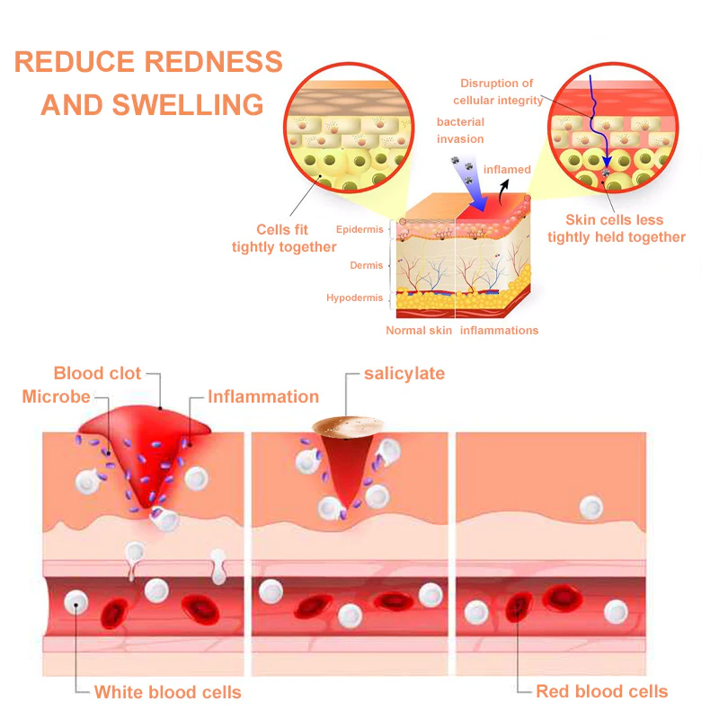 Salicylic acid can reduce skin inflammation by regulating the release of inflammatory cytokines and inhibiting the activation of inflammatory signaling pathways. It helps alleviate symptoms of inflammation such as redness, swelling, and itching. Additionally, it exhibits significant antibacterial effects, especially against Propionibacterium acnes, which is responsible for acne and comedones. It disrupts the integrity of bacterial cell membranes, preventing their growth and reproduction, thereby reducing the formation of acne lesions.