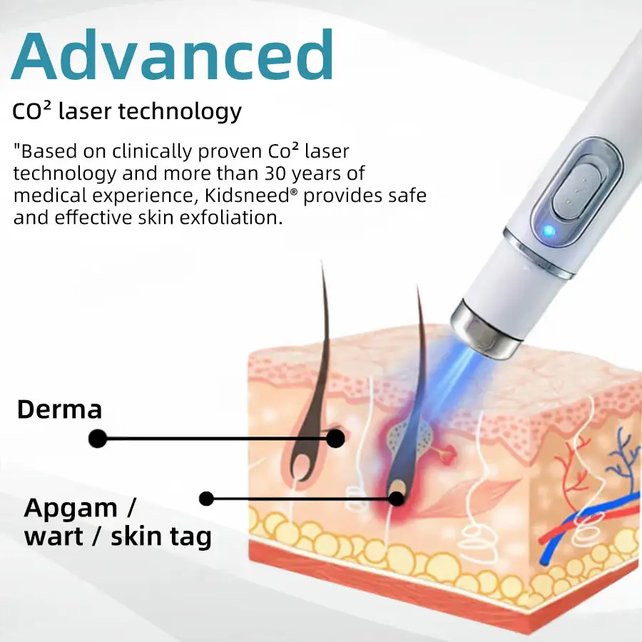 KIDSNEED® utilizes advanced CO₂ laser technology to target and eliminate moles, warts, skin tags, and pigmentation issues with precision. When applied to the skin, the device releases high-temperature electrical ion energy, which works by breaking down melanin and dissolving unwanted tissue at the cellular level. This process effectively reduces dark spots, blemishes, and skin growths without the need for harsh chemicals or invasive procedures. Unlike traditional treatments that may cause scarring or irritation, KIDSNEED®’s ultra-pulsed mode ensures controlled, layer-by-layer removal, minimizing the risk of thermal damage while promoting natural healing.