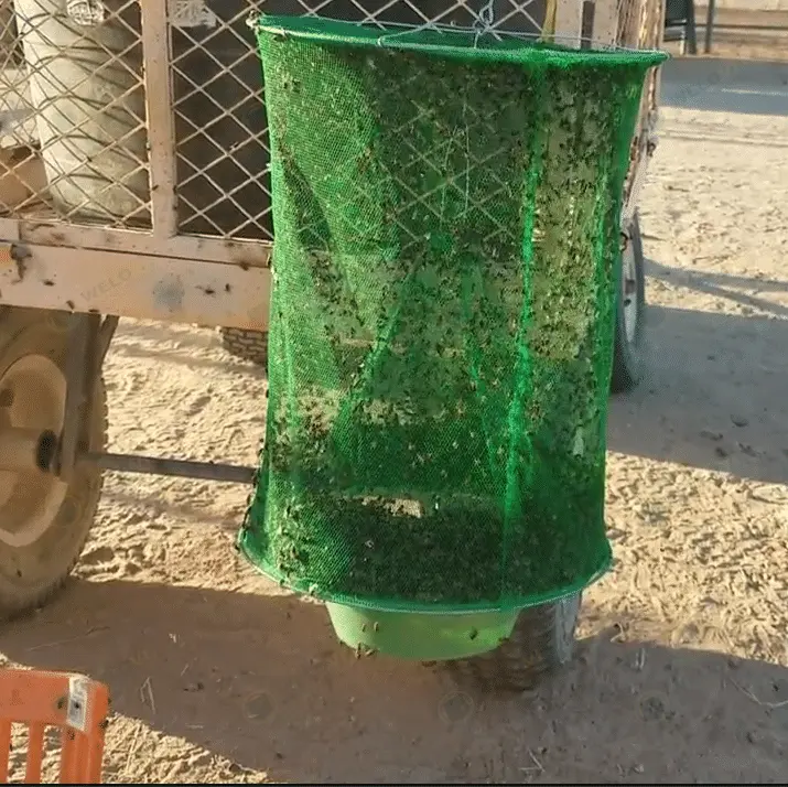 The fly net trap lures in flies to feed on the bait & then as the fly enters, the inside of the trap, the fly will not be able to figure out how to get back out of the trap.