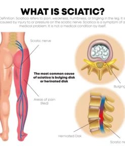 Sciatica occurs when the sciatic nerve becomes pinched. The cause is usually a herniated disk in the spine or an overgrowth of bone, sometimes called bone spurs, forming on the spinal bones. More rarely, a tumor can put pressure on the nerve. Or a disease such as diabetes can damage the nerve. Back pain is one of the most common reasons people seek medical help or miss work.