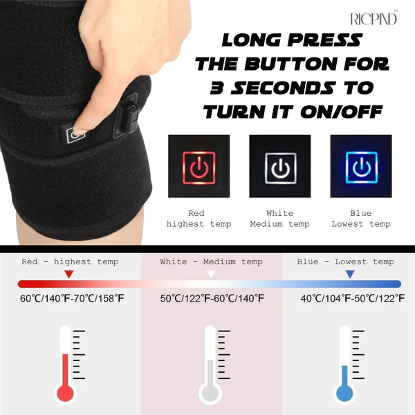 The RICPIND KneeSoothe ThermalTherapy Brace offers a customizable heat therapy experience with three temperature settings. At the highest level, marked in red, it reaches a toasty 111.2℉/44℃, providing intense warmth ideal for extended use. The medium setting, indicated in white, maintains a comfortably warm 105.8℉/41℃ temperature, perfect for extended periods of use. Lastly, the lowest setting, in blue, maintains a gentle 100.4℉/38℃ lukewarm temperature, typically unnecessary for therapeutic purposes. With these adjustable settings, users can tailor their heat therapy experience to match their specific needs and preferences. Additionally, if you connect it to a power bank with an output current higher than 500mA, the temperature can exceed the above measurements, allowing users to enjoy even more heat if desired.