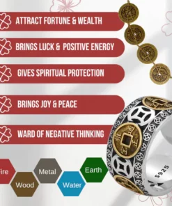 The 5 coins embedded in the ring also represent the five Feng Shui elements (metal, wood, water, fire, and earth), which are thought to be the fundamental elements of everything in the universe and the sites of interactions.