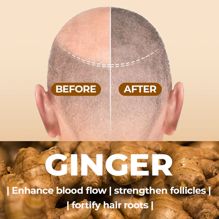 Ginger extract improves blood flow to the scalp, supplying the hair follicles with essential nutrients and oxygen. This improved blood flow reduces inflammation and stops hair loss while stimulating hair growth and renewal. Its antioxidant properties also protect the hair from free radicals and promote stronger, healthier strands.
