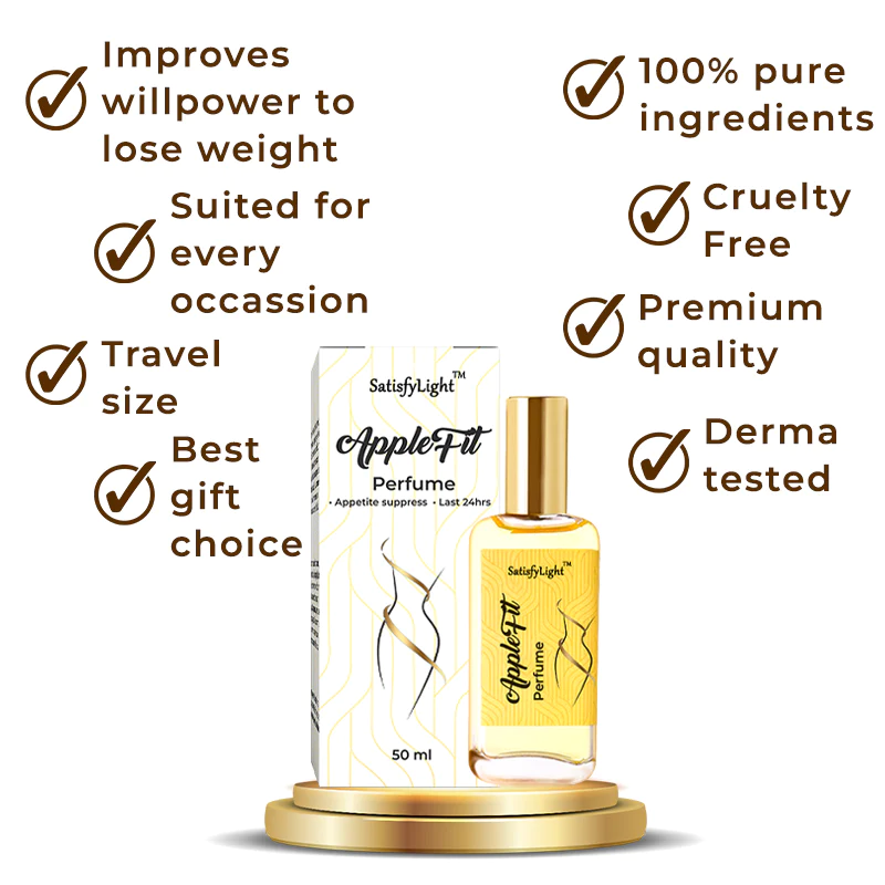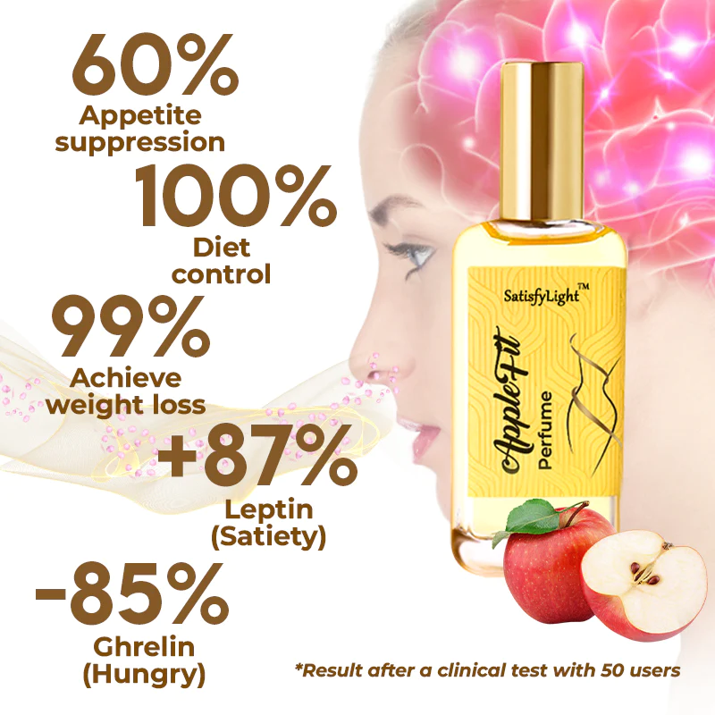 According to American neuroscientists Dr Kirsten, FG., the sense of smell is quicker than the sense of sight, and the smell of apples can cause the brain to pick up on food messages, which can soothe the emotions, calm the mood and prevent gobbling, resulting in less food being consumed naturally. Dr Kirsten and several neuroscientists have shown that SatisfyLight™ AppleFit Perfume affects both the visual and olfactory nerves, increase leptin, stimulating areas of the brain associated with feelings of satiety and satisfaction and sending messages to the brain and stomach about the feeling of fullness, thus stoping binge eating. Fat-burning effect without the need to exercise. It can help to losing an average of 5kg a month.