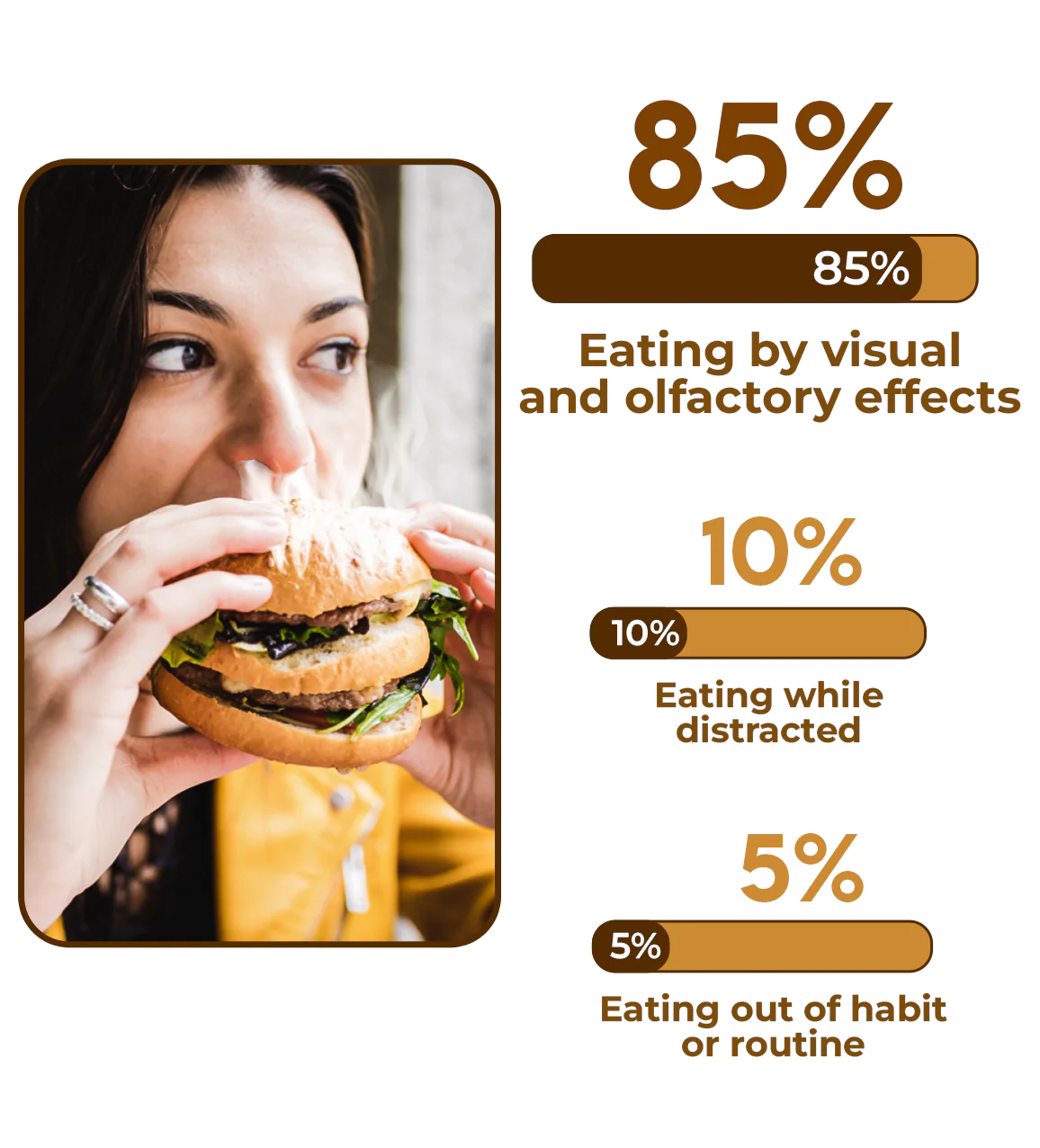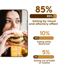 Many psychological counsellors have found that 90% of obese people are obese because of unconscious eating. Unconscious eating stimulates hunger hormones in the nerve cells of the brain, promoting appetite and making people keep on eating. Hunger hormones are used by the gut to inform the brain that it is ‘time to eat’. Neuroscientists have found that 85% of the obesity problem is due to visual and olfactory effects.