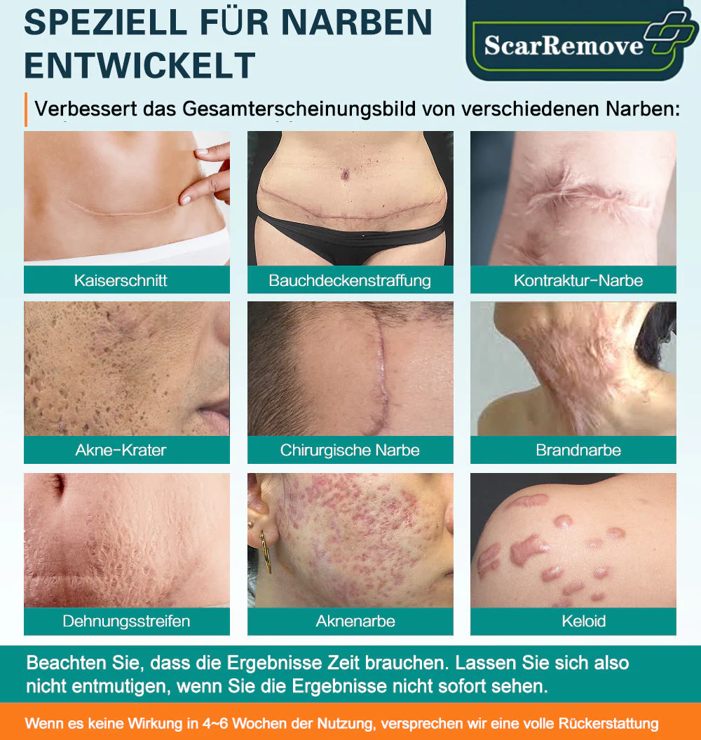 Unser ScarRemove™100% fortschrittliches Spray zur Narbenentfernung hilft. die Narbenstruktur bei allen Hauttypen zu glätten. Wir versprechen. die Narben für so wenig wie 4 Wochen für neue Narben und für 4-8 Wochen alte Narben zu entfernen!