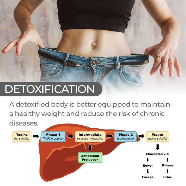 Moreover, detoxifying the body clears out the digestive system, curbs cravings, reduces water weight, and improves metabolism. All of which promotes healthy weight loss and general wellness.