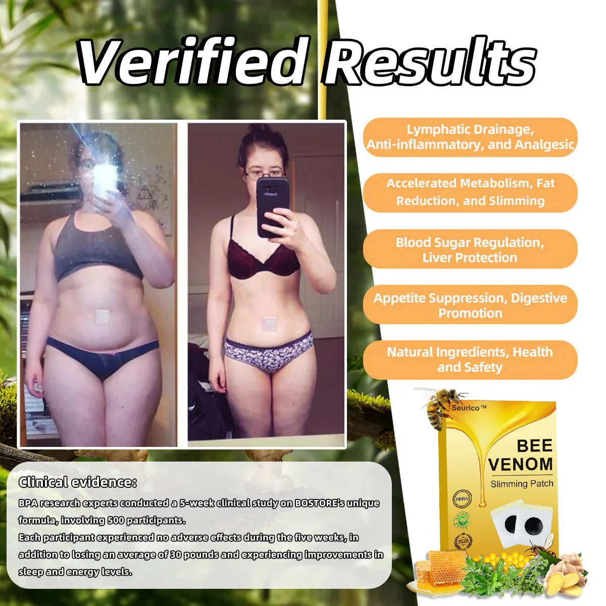 The digestive and lymphatic systems are crucial detox pathways in the body. That’s why we developed the Seurico™ Bee Venom Slimming Patch, containing bee venom and extracts of iceplant, along with four herbal extracts. These highly active ingredients are concentrated and encapsulated within the film of the slimming patch. During application, the close contact between the abdominal area and the silk film made of natural herbs stimulates intestinal peristalsis, allowing for faster and more effective penetration into the lymphatic system. By cleansing the lymph nodes to rid waste, aiding liver detoxification, and absorbing toxins, it improves metabolism, facilitating effortless fat loss, reducing inflammation, and promoting overall bodily health.