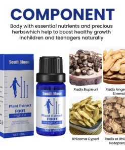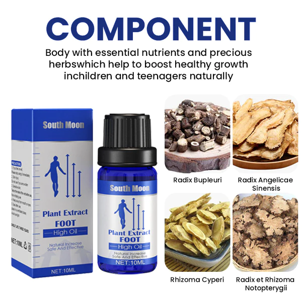The amalgamation of Radix Bupleuri, Radix Angelicae Sinensis, Rhizoma Cyperi, and Radix et Rhizoma Notopterygii represents an optimal composition within our foot oil formulation. Initially, these constituents function synergistically to alleviate inflammatory responses, mitigate discomfort, and combat viral agents within the human organism. Subsequently, they facilitate hematopoietic restoration and the harmonization of vital energy (qi), culminating in the modulation of the immune system. This orchestrated process invigorates the individual, endowing them with enhanced vitality, thereby fortifying osseous functions, fostering bone development, and ultimately facilitating an increase in stature.