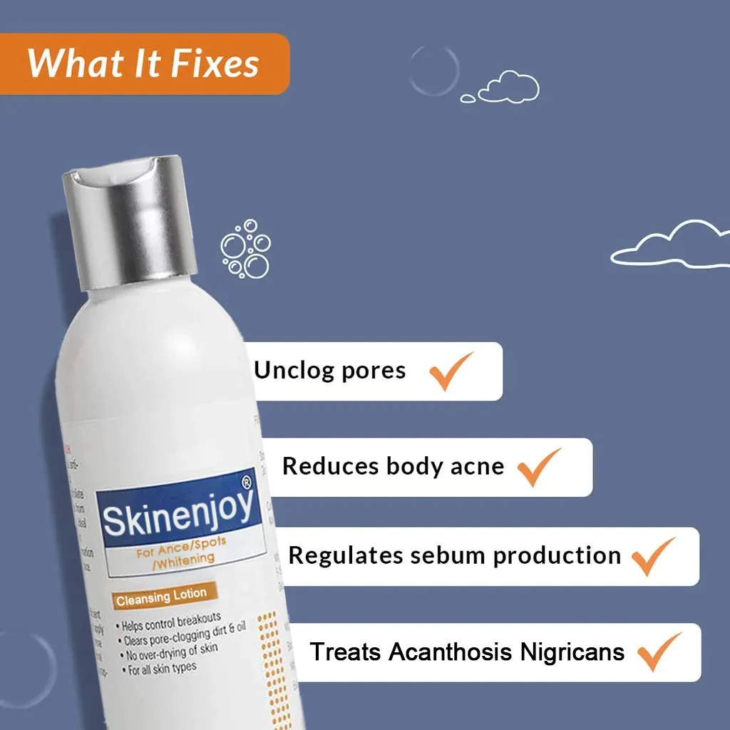 Skinenjoy® Cleansing Lotion features a combination of powerful whitening ingredients for removing black(Grape Fruit Extract)and anti-acne ingredients (Salicylic acid. Azelaic acid and Tea tree oil) to exfoliate dead skin cells and clear the pores from oil. dirt and acne causing bacteria. effectively inhibit melanin synthesis. pigmentation and dark spots. treat acanthosis nigricans. Ideal for all skin types. this Cleansing Lotion helps in reducing the breakouts and inflammation around the face. back. shoulder. chest and other body parts. and treating acanthosis nigricans around the neck. armpits. groin. and under the breasts. It may also occur on the knuckles. palms of the hands. soles of the feet. and in other areas of the body.