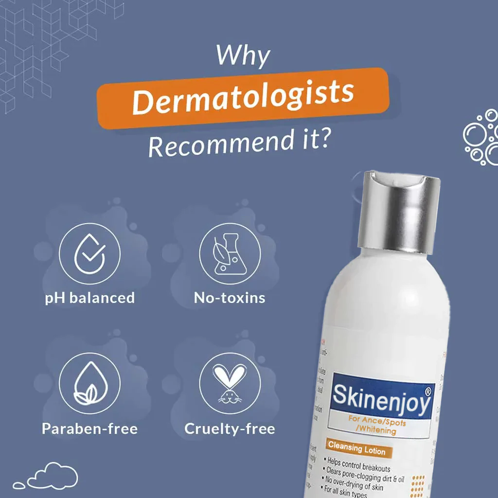 Skinenjoy® Cleansing Lotion by eliminating the buildup of dead skin cells that can contribute to an uneven and lacklustre skin tone. exfoliation can also lighten dark areas. This cleansing lotion works by breaking down the adhesive bonds between dead skin cells. making their removal gentle and effortless.