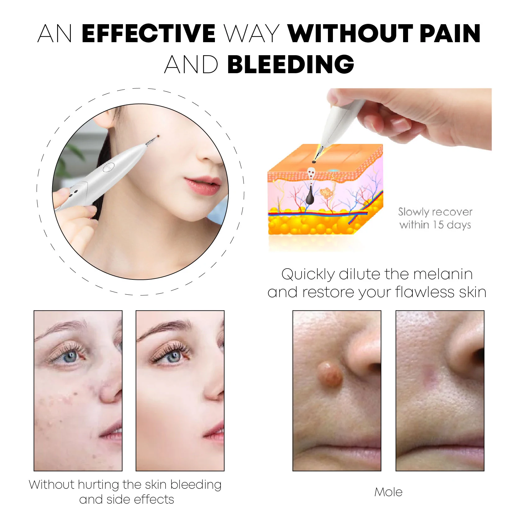 The microvascular will solidify quickly without bleeding, forming carbon scabs that protect the wound from infection. Approximately one week later, the scabs will fade and fall off, leaving no scars. The removal spot will not hurt the normal skin and will not cause bleeding. It is easy to carry and easy to operate.