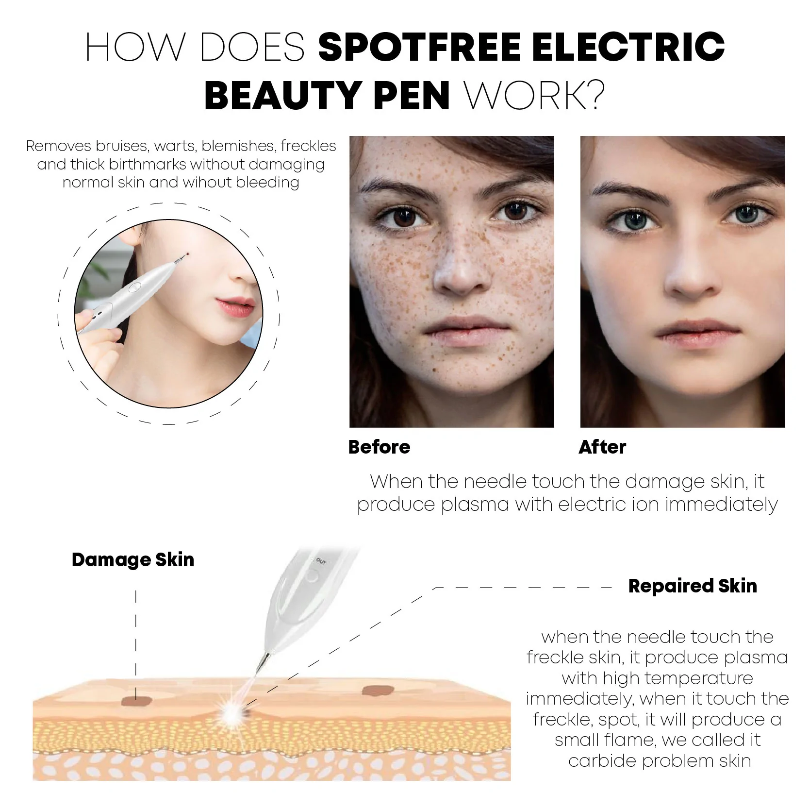 SpotRemoval Beauty Electric Pen is powered by a new generation of plasma micro-district discharge technology with low temperature and high frequency. It uses an efficient capacity conversion material and a microcomputer chip to control the needle. When the needle touches freckled skin, it immediately produces plasma at a high temperature. When it touches the freckle or spot, it will produce a small flame called carbonization.