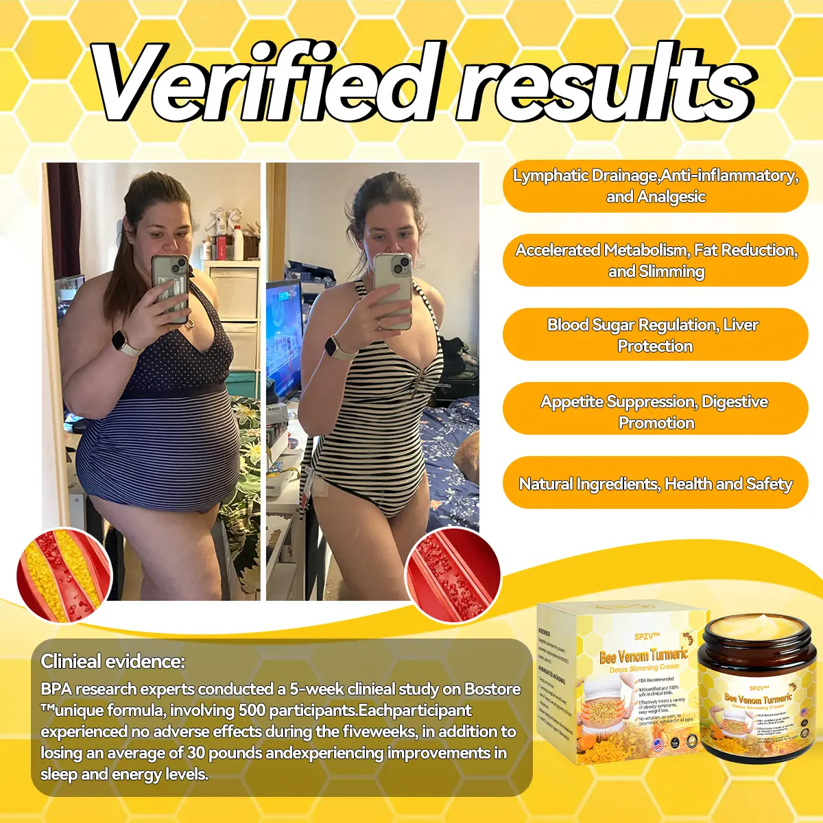 The SPZV™ Bee Venom Turmeric Detox Slimming Cream boasts seven powerful ingredients that have been scientifically proven to assist in weight loss and management for millions globally. These components work synergistically to boost metabolism, burn fat, and suppress appetite, offering comprehensive support for your slimming efforts. Our cream not only aids in reducing body fat but also improves skin elasticity, giving you a more toned and youthful appearance.