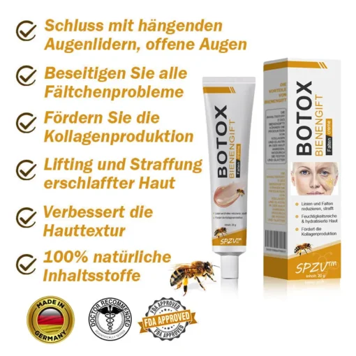 Die 𝐒𝐩𝐳𝐯™ Botox Bienenvenom Faltenentfernungscreme kombiniert modernste Technologie mit einzigartigen Inhaltsstoffen, um speziell hängende Augenlider gezielt zu behandeln und tiefenwirksam zu reparieren. Im Gegensatz zu typischen Produkten auf dem Markt stimuliert 𝐒𝐩𝐳𝐯™ nicht nur die Kollagenproduktion, um die Elastizität der empfindlichen Haut um die Augen zu verbessern, sondern nutzt auch Bienenvenom-Peptide, um die Wirkung von Botox präzise zu imitieren. Dies entspannt die Muskeln um die Augen und hebt schlaffe Augenlider. Die einzigartige Formel dringt tief in die Haut ein, fördert die Durchblutung und sorgt in Kombination mit der tiefen Feuchtigkeitswirkung der Hyaluronsäure dafür, dass die Haut um Ihre Augen prall und voll aussieht. Dies reduziert effektiv hängende Augenlider und verleiht Ihren Augen ein jugendliches, festes Aussehen. Wählen Sie Furzero™, um wahre Hautpflege-Innovation zu erleben und sich vollständig von hängenden Augenlidern zu verabschieden.
