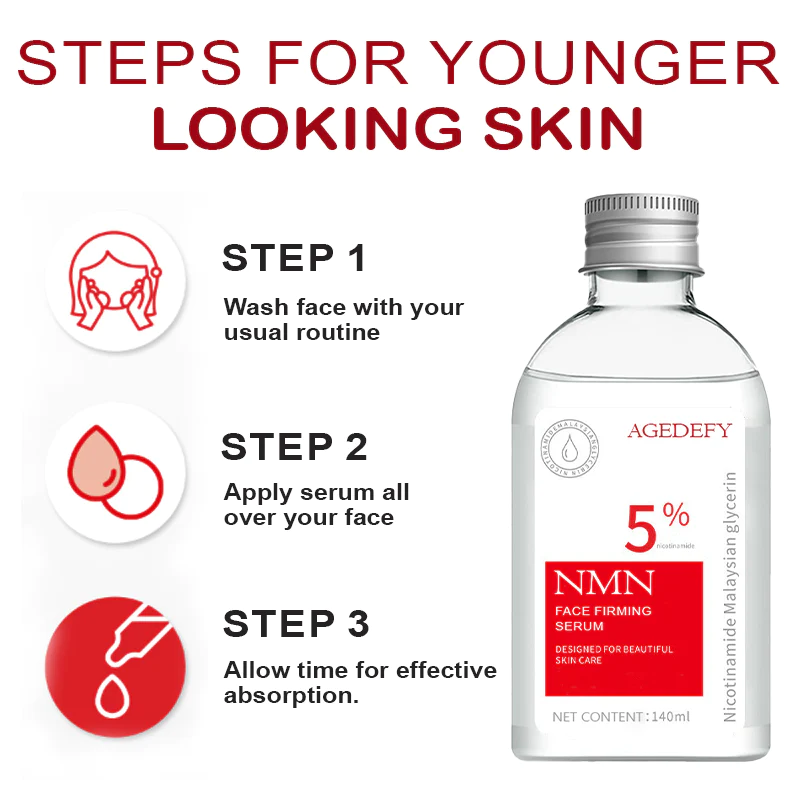 The StayFirm NMN Face AntiAging Serum is a product to help your skin maintain a youthful appearance, firmness, and elasticity. It is designed to increase NAD+ levels and increase the rate of skin metabolism. Our StayFirm NMN Face AntiAging Serum will help you on returning firmness and elasticity more effectively. You will see and feel your skin becoming firmer, more elastic, and less saggy over time. It also repairs and supports protection from the sun and other free radical damage for a combined result of a naturally lighter and more youthful complexion.