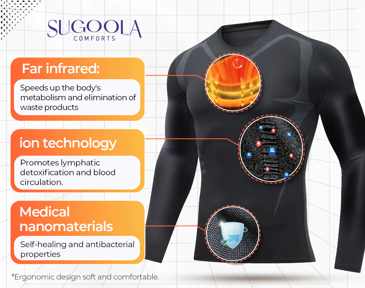 Enhance your posture and alleviate back discomfort with the Sugoola™ Far-Infrared Tourmaline Magnetic Mens Undershirt. This shirt is meticulously crafted to promote better posture by adjusting metabolism, reducing internal body temperature, and simultaneously boosting blood circulation and oxygen levels – all resulting in heightened energy levels.
