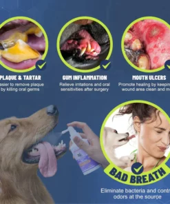 PetClean™ Spray is the latest product certified by VOHC. It can perfectly solve all pet oral problems, including dental calculus, bad breath, oral ulcers, dental caries, bleeding gums, tooth sensitivity, gingivitis, loose teeth, periodontitis, swollen gums, tooth damage, tooth loss, etc. No side effects. Made from 100% natural herbs. Suitable for pet, including dog and cat. Actually works better than dog breath bones, freshener treats, breath freshener mints for dogs, dental chews, dog mouthwash, or other dog teeth cleaning and dental care products