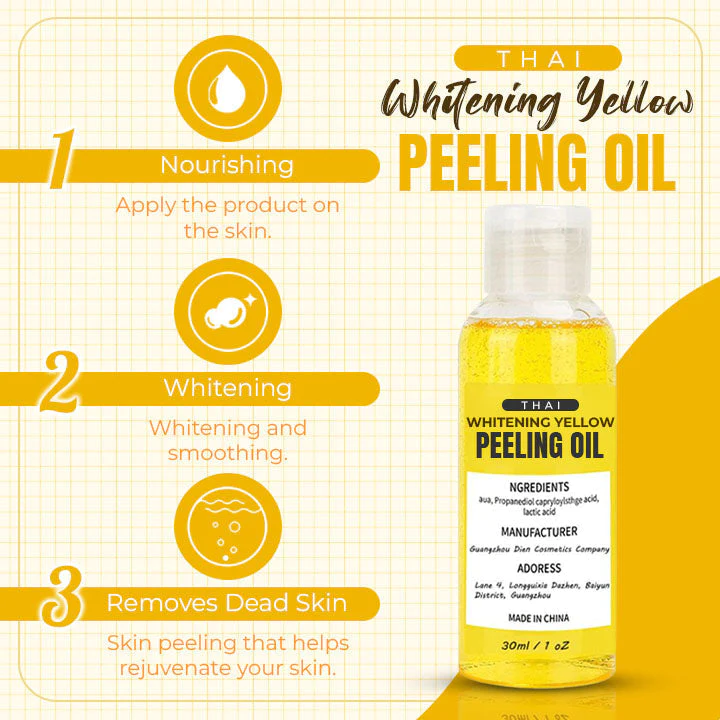Thai Whitening Yellow Peeling Oil is a nourishing, cleansing, moisturizing oil that can be used in all parts of the body. The ingredients in this product work together to cleanse skin and remove excess oil, dead skin cells, and impurities that cause acne and other skin issues. It also helps to restore moisture and elasticity to your skin.