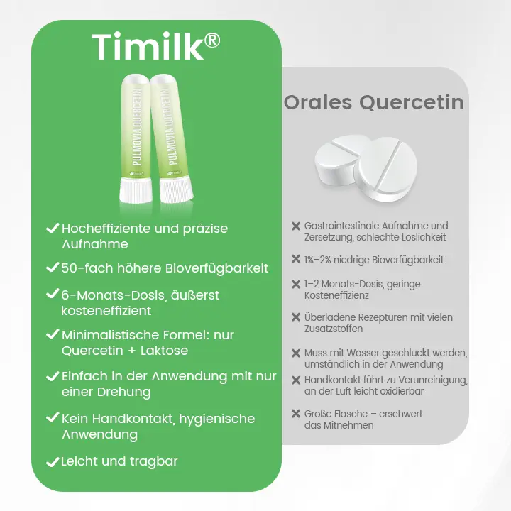 Seit Jahren zeigen orale Quercetin-Präparate aufgrund ihrer schlechten Wasserlöslichkeit und ihres Abbaus im Verdauungstrakt nur eine begrenzte Wirksamkeit – was zu einer Bioverfügbarkeit von nur 1–2 % führt. Timilk® Pulmovia Quercetin Lungenentgiftungs-Inhalator ändert alles. Dank unserer fortschrittlichen 5-Mikron-Ultrafeinpulver-Fließtechnologie liefert Pulmovia reines Quercetin direkt an die Lungenbläschen, umgeht den Darm und erreicht eine unglaubliche Absorptionsrate von 98 % – 50-mal effizienter als Kapseln oder Tabletten. Mit jedem Atemzug erhalten Ihre Lungen schnelle, konzentrierte Antioxidantien und Entgiftungsunterstützung, wodurch besseres Atmen nicht nur möglich, sondern auch mühelos wird.