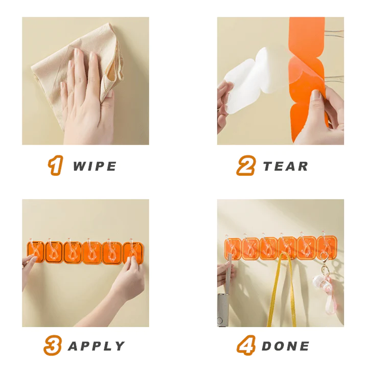 No-Drilling Installation The heavy-duty hook rack can be mounted onto your walls in no time with just a few easy methods. Simply wipe the surface you’re adhering to clean and dry, peel-off the protective film, stick the hook to your desired position, and you’re good to go. No more complicated tools and drilling installation needed which only leave permanent damages to your walls. This 6-hook rack can be also effortlessly removed anytime without any sticky, messy residues behind.